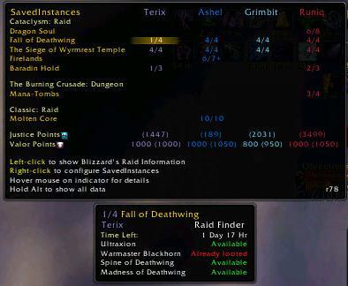 После установки SavedInstances, вы сможете отслеживать время прохождения, время последнего посещения, убитых боссов, КД боссов, выполненные квесты и многое другое.